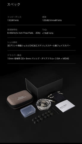 ダイナミックドライバー、パッシブダイアフラム、3基のバランスド・アーマチュア、そしてダイレクトドライブMEMSユニットを組み合わせているのが特徴。