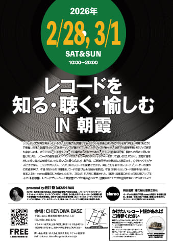 レコードの魅力を深掘りするイベント「レコードを知る・聴く・愉しむ IN 朝霞」が、埼玉の朝霞で2月28日、3月1日の2日間、CHIENOWA BASE(埼玉県朝霞市本町2-7-27)で開催される。岩井喬氏がナビゲーターとなり、レコードプレーヤーの操作や、音の出る仕組みの解説、レコードのフリー演奏などが行なわれる。入場料は無料で、事前登録も不要。