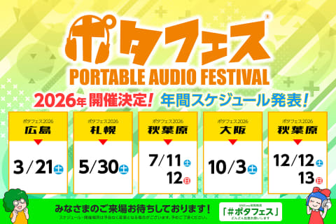 e☆イヤホンは、3月21日にイヤフォン・ヘッドフォンを中心とした“ポータブルオーディオ”の試聴&体験イベント「ポタフェス 2026 広島」を開催する。入場無料、事前登録なしのフリー入退場で、開催時間は11時~17時、最終入場は16時30分。