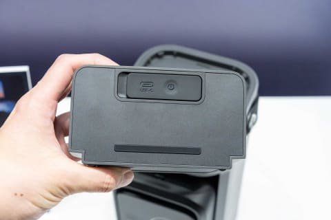 スピーカーはバッテリー内蔵で、プロジェクター本体にドッキングすることで充電できる。約3時間の充電で最大20時間使用できる。スピーカーにはUSB Type-Cポートも備えており、USBケーブル経由での充電もできる。