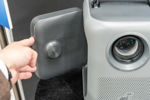 左右90度、上下200度に回転できるフリップ式スピーカーを本体に内蔵したプロジェクターで、設置場所を選ばずにステレオサウンドを楽しめる。スピーカー出力は10W×2。フリップ式スピーカーを内蔵したプロジェクターは世界初とのこと。