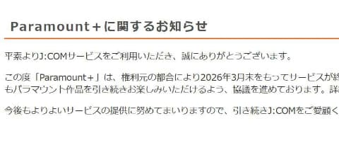 J:COMは、J:COM STREAMで提供中の「Paramount+」について、権利元の都合により3月末でサービスを終了すると発表。Leminoも3月31日をもってサービスを終了すると案内している。