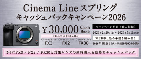 ソニーマーケティングは、α、Cinema Line、VLOGCAMを対象にしたキャッシュバックキャンペーンを実施する。購入期間はそれぞれ2月20日から5月11日まで、応募締め切りはWebが5月26日10時まで。