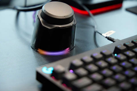 製品には2.4GHzワイヤレスドングルを内蔵したベースステーションが付属。上部にノブ型コントローラーを備え、手元で音量調整やマイクのミュートなどができる。