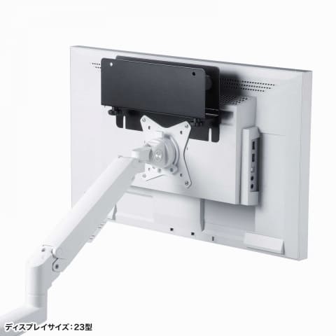 VESA規格のネジ穴を使って、モニター裏に設置できる収納ホルダー。置き場所に困りやすい外付けHDDや小型PC、ドッキングステーションなど幅広い機器を設置できる。