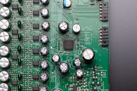 同じ筐体にデジタル/アナログが混在するAVレシーバーでは、デジタルノイズの抑制が大事となり、特にDACの信号ラインや、物理的に近接する箇所のノイズ対策にはAV 10の開発ノウハウを存分に投入し、高速動作するデバイスは、信号ラインが最短になるよう最適に配置。DSPやHDMI入出力デバイスのように激しい消費電流の変動が生じるデバイスには直近にレギュレーターを配置している。