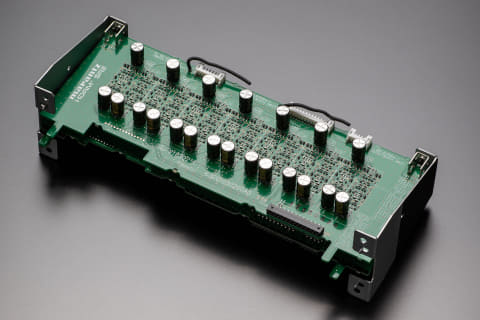 ブロックコンデンサーは、AV 30専用に開発されたカスタムコンデンサーで、6,800μF ×2のものを搭載。電源トランスにアルミ製のケースとケイ素鋼板によるシールドを追加することで、漏洩磁束を抑え、高品位な電源供給を実現。