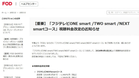 FOD、F1ライブ配信の「フジテレビNEXTsmartコース」を600円値上げ。4月から