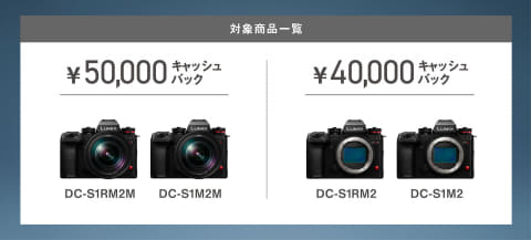 対象のミラーレス一眼カメラのボディ、レンズキットをキャンペーン期間中に購入すると参加できる。1人につき1台のみ、1回のみの応募できる。対象モデルとキャッシュバック金額は、DC-S1RM2M、DC-S1M2Mが各50,000円、DC-S1RM2、DC-S1M2が各40,000円。