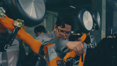 ボールを蹴るため、どう強くドアを開くか? 爆発的なパワーを出すエアシリンダーで押し出したり、大型の油圧ショベルのカゴの回転をヒントに強く開いたり。ただ、ドアを開いて蹴っても、ボールは地面を転がるだけ。浮かして蹴るにはどうすれば……すくい上げる? 蹴るポイントを変える? 次々アイデアを試すが、右隅・左隅などコーナーを狙うまでにするのは至難の技。
