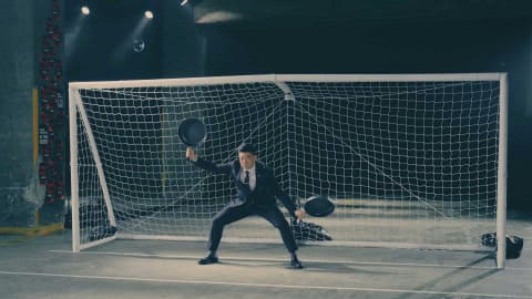 魔改造して行なう競技は、サッカーのPK対決。「冷蔵庫」がボールを蹴る“キッカー”に、「フライパン14個とキッチンラック」が“キーパー”になり、世界初、見たことのない大興奮のPK対決が行なわれる。