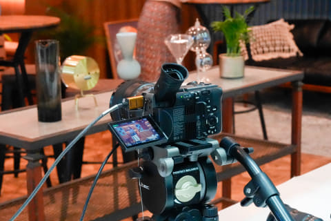 BURANOのとともに「FX6」「FX3」が横並びに展示されており、上部のモニターでそれぞれの撮影映像を表示。暖色系の照明を使ったバー風のスタジオを撮影する際にも、揃った色合いで撮影できるほか、それぞれに触れることで、同じオペレーションで操作できることがわかるようになっているとのこと。