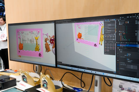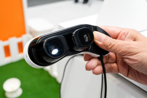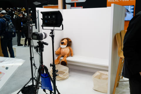 現実とバーチャルを組み合わせたMR(複合現実)のエリアにも参考展示の製品を用意。HMDを小型にしたような手持ちのデバイスで、のぞき込むことで現実とバーチャルを組み合わせた映像が楽しめる。カメラのファインダーにも使われている自由曲面プリズムを採用しており、他社の類似製品よりも小型かつ明るい映像が楽しめることがポイントだという。