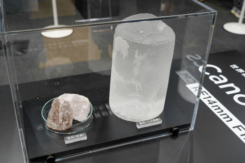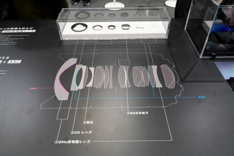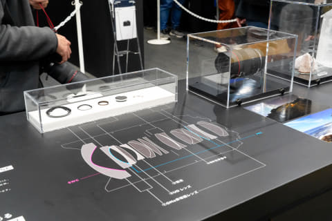 動画撮影ユーザーにも注目してほしい要素として、新登場したレンズから、全周190度の画角をカバーできる「RF7-14mm F2.8-3.5 L FISHEYE STM」と、蛍石を採用し小型軽量化した「RF14mm F1.4 L VCM」が挙げられた。RF14mm F1.4 L VCMは詳しい解説や、実際に使われている人工結晶の蛍石の展示も行なわれている。