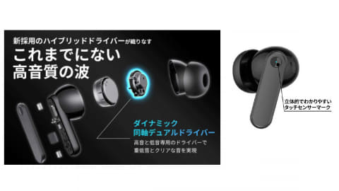 ケースはイヤフォンが取り出しやすい形状で、イヤフォン本体は指で触ってわかるタッチセンサーマークを採用した。