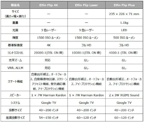 エントリーモデルとなる「Elfin Flip Plus」は、LED光源を採用し、500 ISOルーメンの明るさとフルHD解像度に対応。OSにGoogle TVを採用しており、手軽に快適な映像体験が楽しめる。コントラスト比は4,000:1(EBL ON時)。