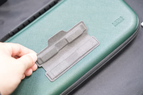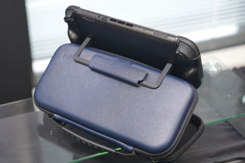 ケースの内部に、強度のある板が入っており、その板を支え棒のようにすることで、ケースを半分開いた状態で固定できる。ケースの上蓋には、Nintendo Switch 2背面にあるスタンドを挟んで固定するための磁石を備えており、そこでNintendo Switch 2のスタンドをホールドする。これにより、キャリングケース自体を、Nintendo Switch 2のスタンドとして使用できるようにした。