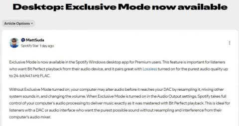なおExclusive Modeは、ミュージックビデオやポッドキャスト、canvasなどには非対応。また“真のビットパーフェクト再生”を楽しむには、クロスフェードやオートミックス、ノーマライズ、イコライザーもOFFにするよう呼びかけている。