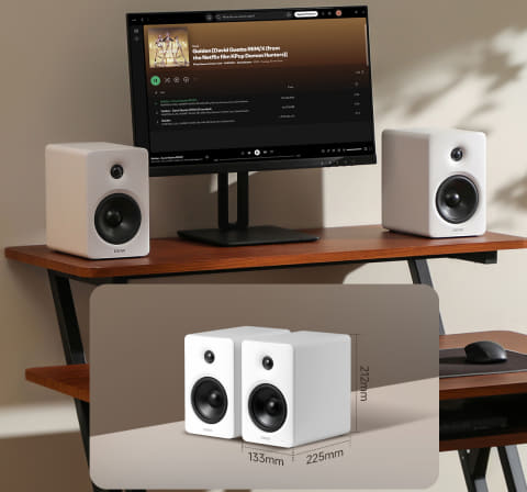 外形寸法は右スピーカーが133×225×212mm(幅×奥行き×高さ)、左スピーカーが133×210×212mm(同)。重量は6.05kg。1インチのシルクドームツイーターと、4インチのロングストローク・アルミ ミッドバスドライバーを搭載した2ウェイ構成。高効率デュアルClass-Dアンプを搭載する。