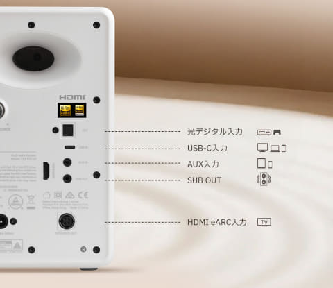 Bluetooth受信に加え、USB-C、HDMI eARC、光デジタル、AUX入力を搭載。PCと組み合わせてデスクトップスピーカーとして使うだけでなく、本棚に置いたり、テレビの音質を強化するスピーカーとして使うこともできる。