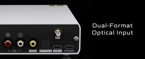 コンパクトなDACで、入力は、光デジタル、同軸デジタル、USBを搭載。光デジタルはS/PDIFおよびADATに対応、高精度なFPGAベースの信号検出システムを搭載し、どちらの信号方式なのかを自動認識する。USB入力は、768kHz/32bitまでのPCMと、DSD512のネイティブ再生も可能。