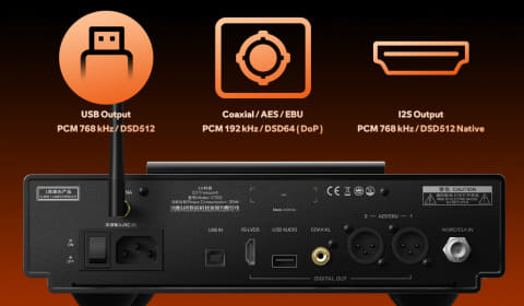 多様な出力系統を搭載。I2S出力、USB出力、同軸デジタル出力、AES/EBU出力を搭載する。