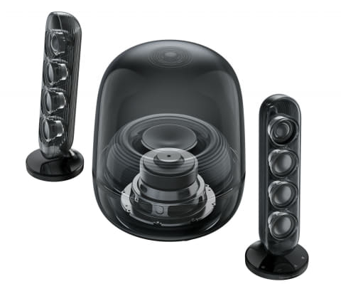 スケルトンデザインを継承しつつ、スタイリッシュなカラーリングとメタリックアクセントを融合。中央がサブウーファー、左右にサテライトスピーカーを配置した2.1ch構成。