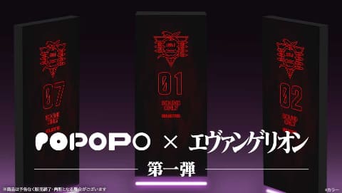 「カメラのいらないテレビ電話」アプリのPOPOPOは、エヴァンゲリオンとのコラボレーション第1弾として、アプリ内で使える「ホロスーツ」より「ゼーレモノリス01~07」を発売した。価格はアプリ内コインで各2,000枚(2,000円)。