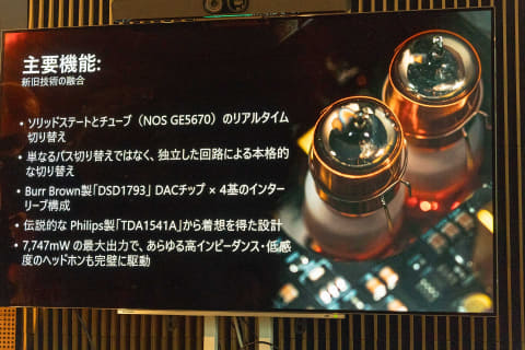 そのほか、DACと真空管をそれぞれ独立した回路で搭載し切り替え可能なこと、最大出力7,747mWの純A級アンプ搭載でハイインピーダンスのヘッドフォンも駆動できることを紹介し「いろいろな“美味しいところ”をひとつの筐体に詰め込んだ製品で、1台でさまざまな体験ができる」とした。
