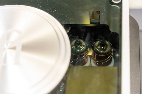 内部にはバーブラウン製DACチップ「DSD1793」4基をインターリーブ構成で搭載。さらに真空管「NOS GE5670」も採用する。動作モードはソリッドステート/Tube(真空管のみ)/Tube+(ソリッドステートと真空管の同時利用)をリアルタイムで切り替えられる。ソリッドステートと真空管は、単なるパス切り替えではなく、それぞれの回路が独立した設計となっている。