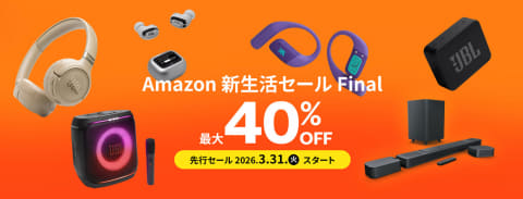 ハーマンインターナショナルは、Amazon新生活セール Finalにおいて、JBLブランドのワイヤレスイヤフォンやポータブルスピーカー、サウンドバーなどを最大40% OFFのセール価格で販売する。期間は4月6日まで。