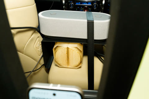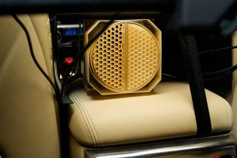 コンテンツの没入感を高める立体音響は、前方に1台、後部座席3列目のドリンクホルダー付近に2台の計3台のスピーカーで再生されている。座席がスイートポイントになるようにセッティングされている。