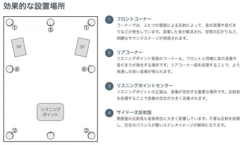 設置場所は、フロントコーナー、リアコーナー、リスニングポイントセンター、サイド一次反射面などが効果的としている。コーナーや天井付近の混濁した音を抑え、ぼやけていた音像を明瞭にし、空間表現やサウンドステージの再現性を高める。