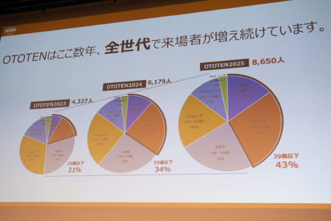 オーディオファンから初心者、若年層、ファミリー層まで幅広い来場者に向けたイベントで、参加者、団体は計78社。昨年のOTOTEN2025は、来場者数が前年比140%の8,650人となったほか、来場者の40%以上が40歳未満の若年層を中心に新たな層の広がりが見られた。