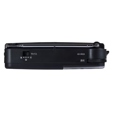 シンプルな小型ラジオ。側面には強弱2段階で切り替えられるLEDライトを搭載し、強モードで約150時間、弱モードで約600時間の点灯が可能。
