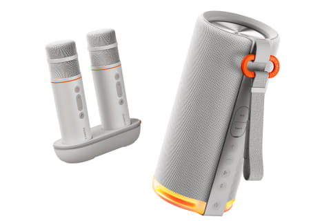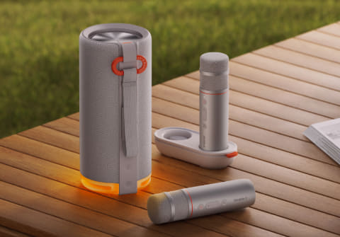 持ち運びが可能な50Wステレオスピーカーと専用マイクを組み合わせた、ポータブル型の音響セット。自宅でのカラオケ用途のほか、屋外でのパーティーやキャンプ、旅行など、さまざまなシーンで手軽に音楽体験を楽しめる。Bluetoothによる接続のほか、オーディオ端子とUSB-C端子を備える。