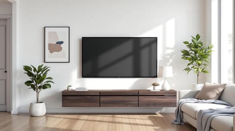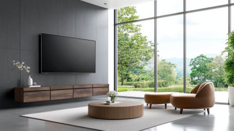 壁掛けテレビと組み合わせるフローティングボード。ユニット連結でレイアウト構築