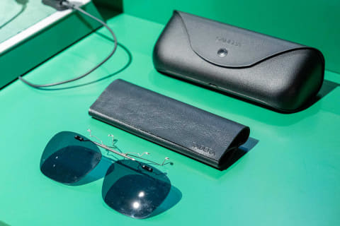 メガネとしてのデザインはボストンクラブが行ない、ウェリントン型を採用しつつ横幅や上下幅を調整して、かけたときに違和感のないデザインを実現。前後の重量バランス調整や、テンプル(つる)の自然に抱き込むような素材とバランス感も追求した。重さは40g。