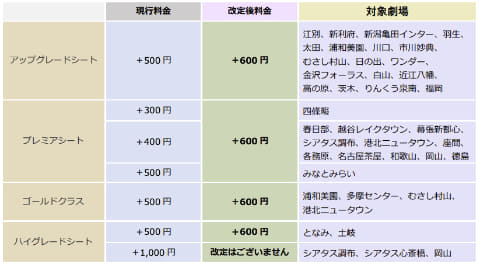 そのほか、ワンドリンク付きの各種シートの追加料金もそれぞれ値上げ。シアタス調布、シアタス心斎橋、岡山のハイグレードシートは据え置きとなっている。