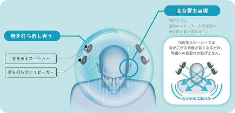PSZ技術は、ある音波(正相)に対して180度位相を反転させた波形(逆位相)を重ねると音が消える原理を応用し、「音を出す」「音を打ち消す」の2つを同時に行なうことで、オープンな環境でありながら、特定の範囲に音を閉じ込める技術。これにより周囲への音漏れを抑え、必要な音だけを高音質で楽しめるプライベートな音空間を実現する。