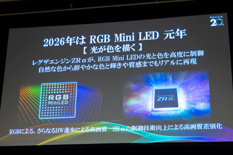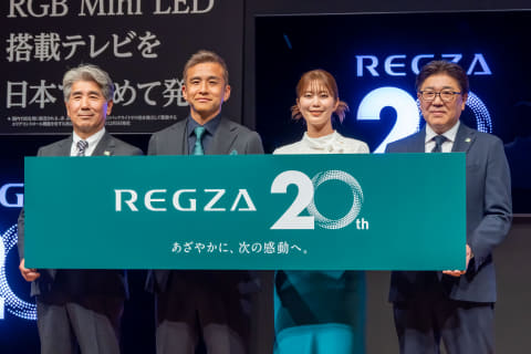 TVS REGZAは21日、RGB LEDバックライト搭載の4K液晶テレビやブランド初のイヤフォンを含む「2026年春夏新製品」の発表会を開催した。レグザブランドが誕生して20周年を迎えたことに合わせ、レグザの今後の施策も発表された。