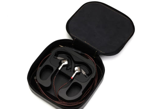 本革製キャリングケースが付属。イヤフォン本体と一緒に、ケーブルにクセがつきづらいように大きく巻いて収納・持ち運びできるよう設計されている。