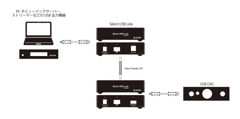Silent USB Linkでは、ユニット間をSilent Fidelity SFP による光伝送で接続することで、GNDの完全分離を実現。電気的結合をゼロに抑え、ノイズの伝搬経路そのものを物理的に遮断したとする。