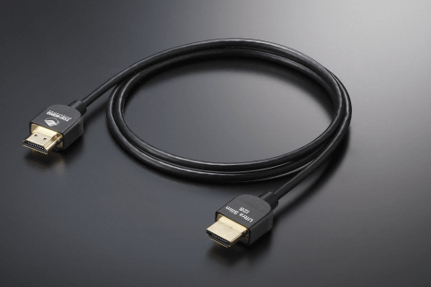 長さ1m限定の専用ケーブルとして設計。一般的なHDMIケーブルは数m~十数mの長距離伝送を前提として設計されるため、伝送マージン確保のために太径導体や厚い被覆が採用されることが多く、ケーブルは太く硬くなりがちになる。