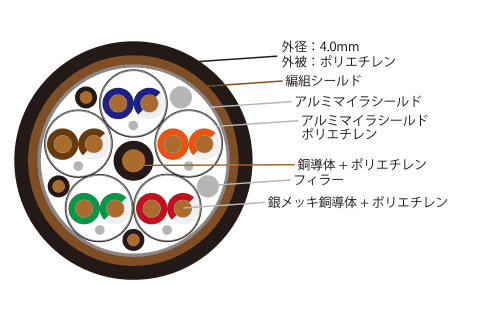 絶縁材・外被には特性の優れるPEを採用。 ケーブル内部では信号線とそれ以外のラインを明確に区別している。高速信号を伝送する通信ラインには高周波特性に優れた銀メッキ銅導体を使用し、制御信号や電源供給に使用される可能性のあるラインには適切な導体構成を採用することで、信号の役割に応じた最適化をしている。