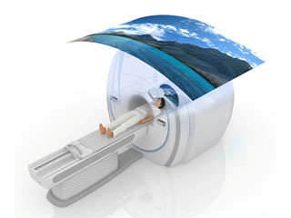 寝台の位置に応じて動く半透過ドーム型スクリーンをボア内に設置。磁界の影響が及ばないMRI検査装置の後方に設置したプロジェクタから、スクリーンとボア内カバーに映像を投影し、寝台に設置されたミラーに反射された映像を患者が見ることにより、検査空間を感じさせない映像空間を実現するという。