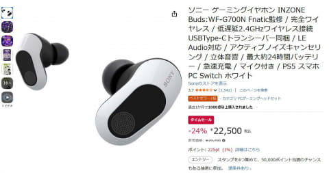 Amazonで、ソニーのゲーミングブランド「INZONE」のイヤフォンやモニター、マウスなどがタイムセール価格で販売されている。2月27日16時30分に編集部が確認したところ、ワイヤレスイヤフォン「INZONE Buds」は通常29,700円のところ24% OFFの22,500円だった。
