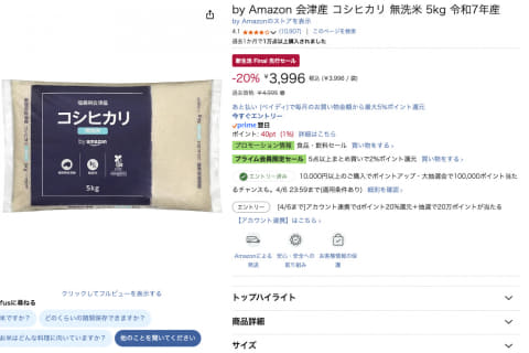 Amazonで「会津産 コシヒカリ」5kgが3996円。数量限定