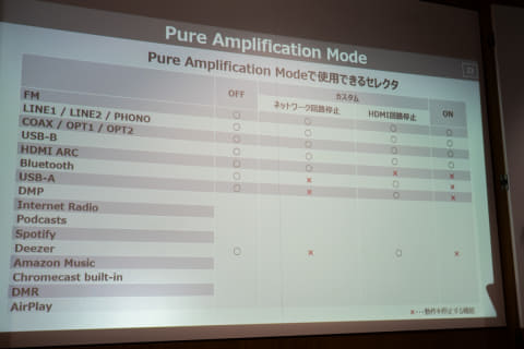 さらに、ネットワーク再生回路、HDMI回路の電源を個別にシャットオフし、デバイス・アンテナからのノイズも排除し、各回路の電源余裕度を向上させる「Pure Amplification Mode」も搭載。使い方に合わせて設定メニューから電源をOFFにしたい回路を個別に選択できる。