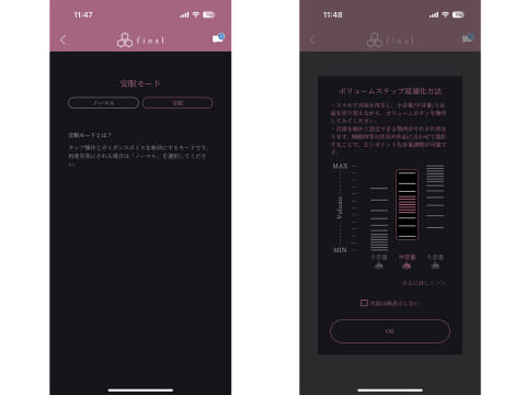 専用アプリとの連携は可能。COTSUBU for ASMR MK2/3Dは5回連続タップで、タップ操作とアナウンスなどが消える安眠モードに変更できたが、ZE500 for ASMRはアプリから切り替える必要がある。ほかにも、一番使うボリューム帯を設定することで、細かく音量調整が可能になるボリュームステップ最適化もアプリから行なえる。